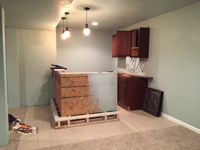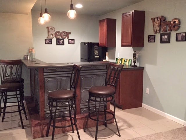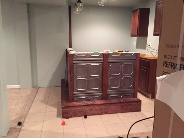 My husband and I took turns laying the tile floor and then had some time away from the bar area to let it all cure. We purchased our cabinetry brought it home and installed it. So we placed the cabinets roughly in their final home. The next part was simply leveling, marking where the studs were on the adjacent wall and the bar wall, screwing in the cabinets, and hanging the wall cabinets.