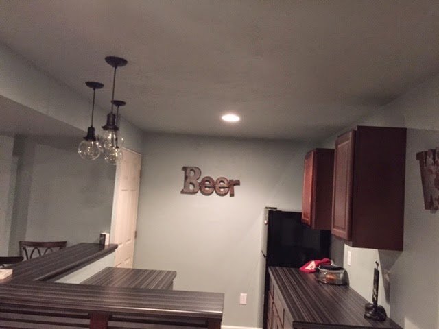 So here is a picture of the final product. The last step that I just completed this weekend was tacking on the kick boards under the cabinets and hanging the wine and beer photos. I found some great photos on google, and since they were for personal use I simply downloaded and printed. Overall cost of this project… I couldn’t tell ya!