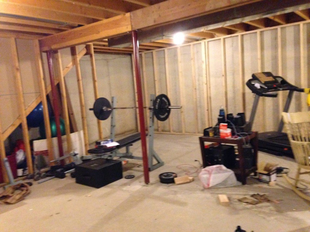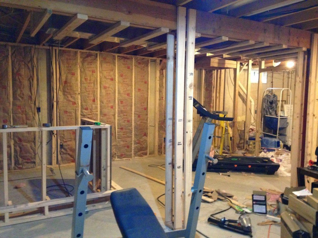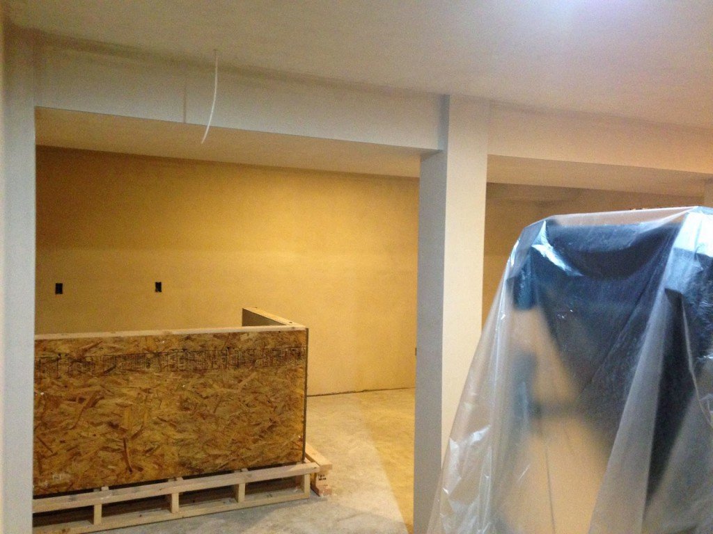 So now the bones of the bar are in place and the next step was to have the inside drywalled and plywood attached to the front side. We hired a company to drywall and plaster the entire basement, so I had them drywall the inside portion of the framed bar wall. I then painted the drywalled side because this part of the bar would still be visible after cabinets and counter tops were installed. To make things easy on myself I cut down two pieces of plywood and nailed it to the front sides of the bar. With plywood on the front I wouldn’t have to find studs every time I was attaching something to it.