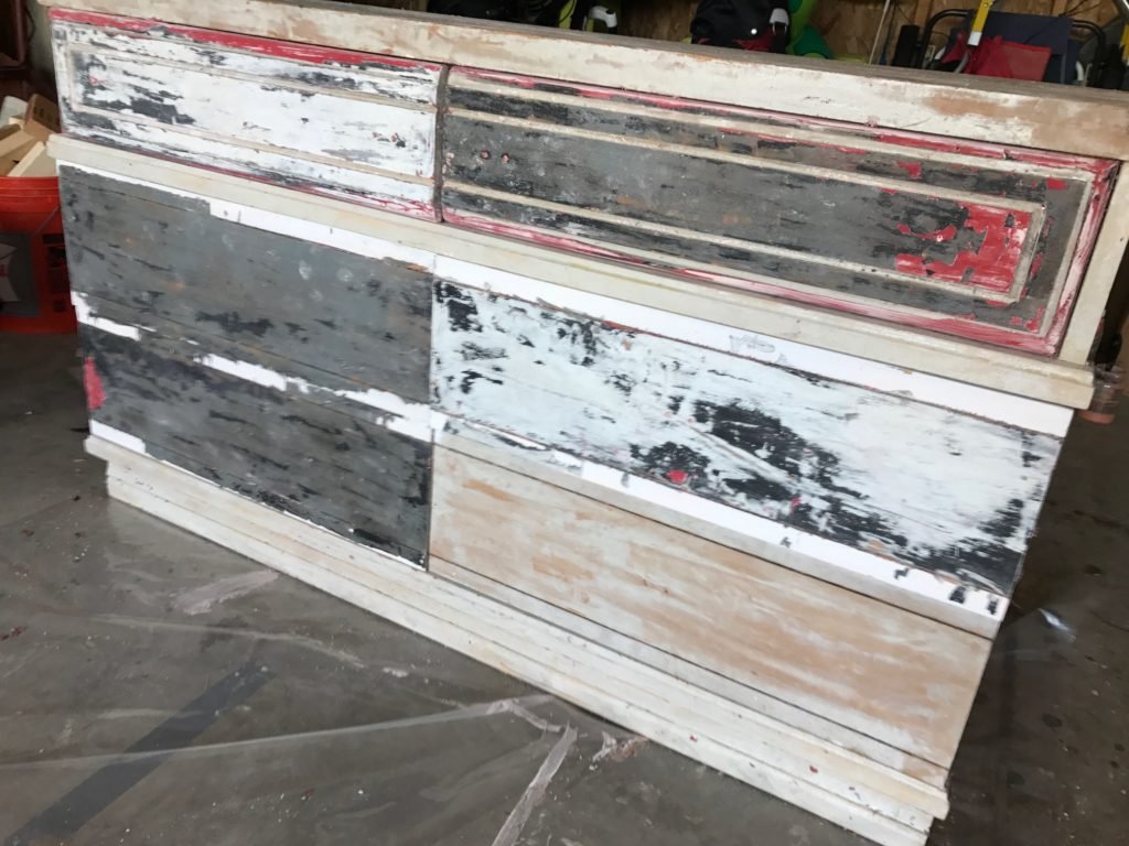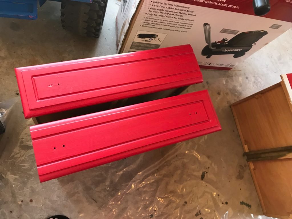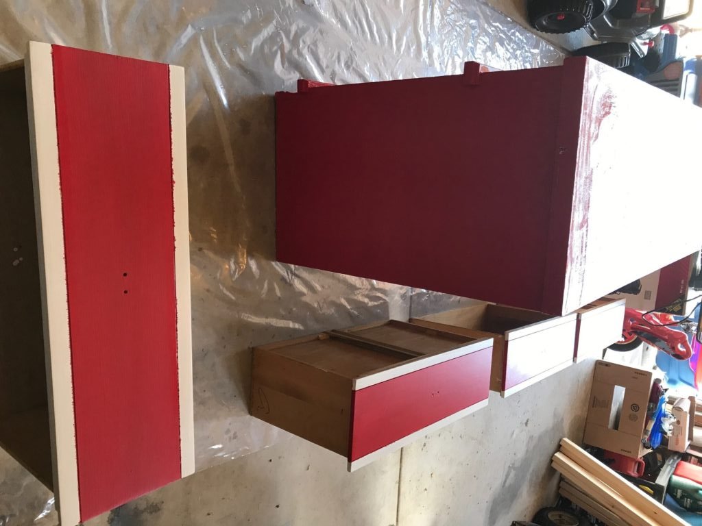 This is the second dresser that I have refinished, this one was for my son. This dresser was a bit more complicated due to it’s history~ It was a ‘fun’ yellow stain/sealant. Then it was painted black by yours truly. Next I painted it red and white for my son to go with his room theme of things in the car’s world, red, yellow, green and such. Once I was done painting it I, and my husband, hated it. So instead of getting moved to the bedroom to house all our little ones cute little clothes, socks, and jammies it went to the garage to sit for nearly 5 years. We bought a dresser from target to do the job but after a few times of JLS climbing up on it do do what boys do best, the drawers broke and was nearly impossible to open or close.