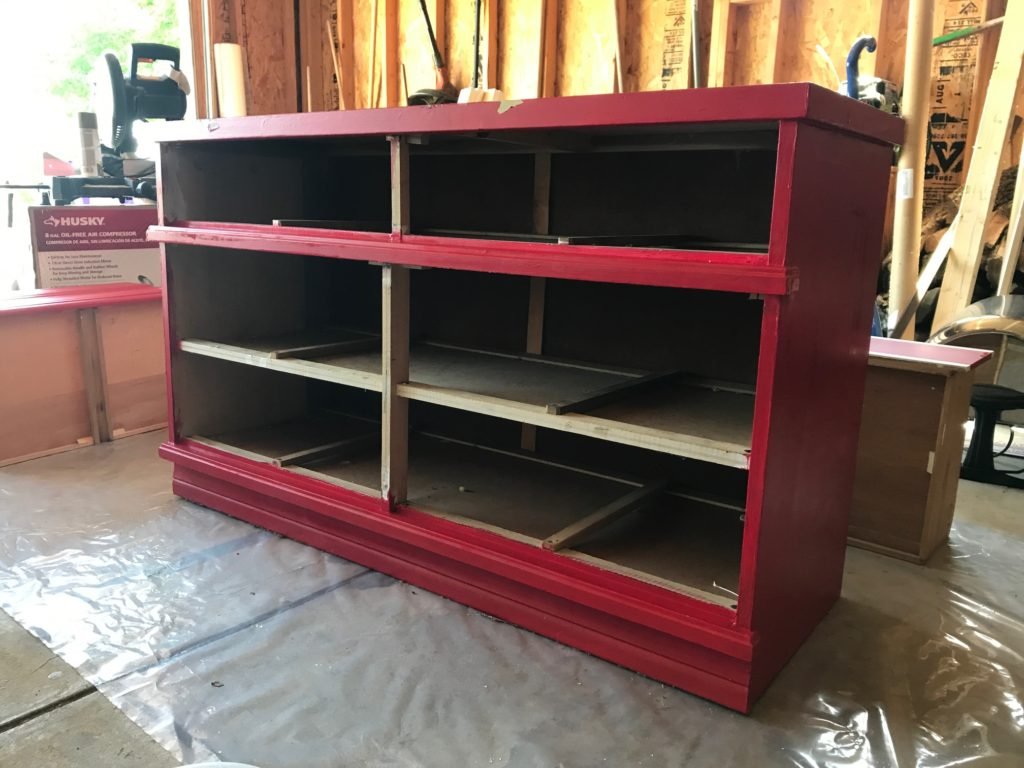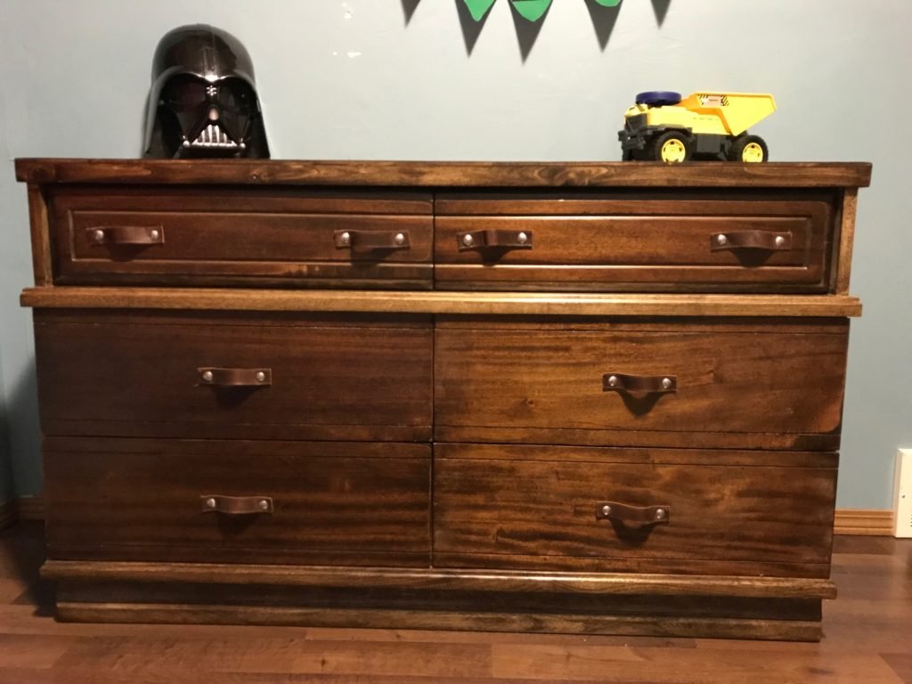 This late summer I decided it was time to clean out the garage a bit and get to work on that old – but really well made- dresser. At first the plan was to paint the dresser a brick red with staining the dresser drawer fronts… But after stripping the dresser and sanding I just didn’t feel that did the dresser justice. So I convinced my son to let me just stain it a rich brown color.