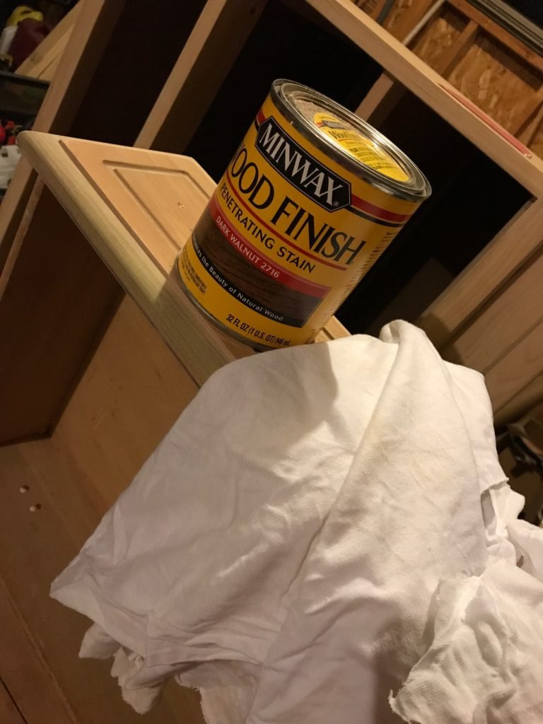 I think that when I get to this stage I’m so happy because I feel like the main work is down and it’s on to seeing what the final product will look like even before it’s really done. Here’s a shot of my clean drawer front, staining rag and stain.
